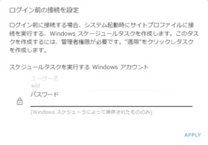 をクリックして、スケジュールタスクを実行するWindows アカウントのユーザー名とパスワードを入力し[適用]をクリック