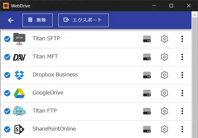 WebDrive を起動後、その他のアクションをクリックし、[接続をインポート]をクリックしてバックアップしていた .wdexport ファイルを選び[開く]をクリック