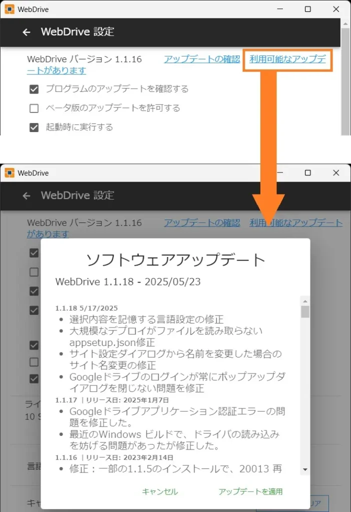 をクリックして WebDrive 設定を開いて「アップデートの確認」をクリック