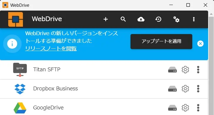 をクリックして WebDrive 設定を開いて「アップデートの確認」をクリック